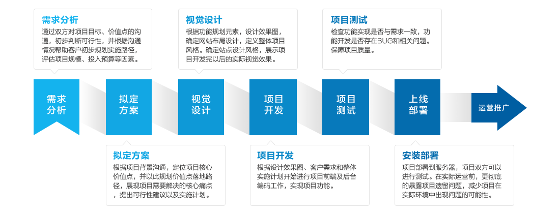 從項目策劃、架構設計、視覺設計到前後端技術開發,提供全程化、一體化服務模式。