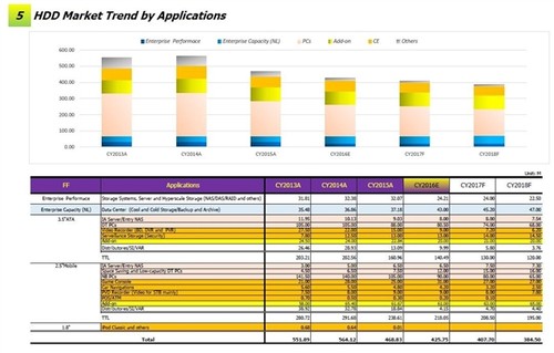 會議上給出數據顯示,硬盤出貨量自2010年達到峰頂的6.5億塊以來一直呈現下跌趨勢,2016年出貨量僅為4.25億塊,比2015年減少了9.2%,相比2010年更是下跌了35%之巨。