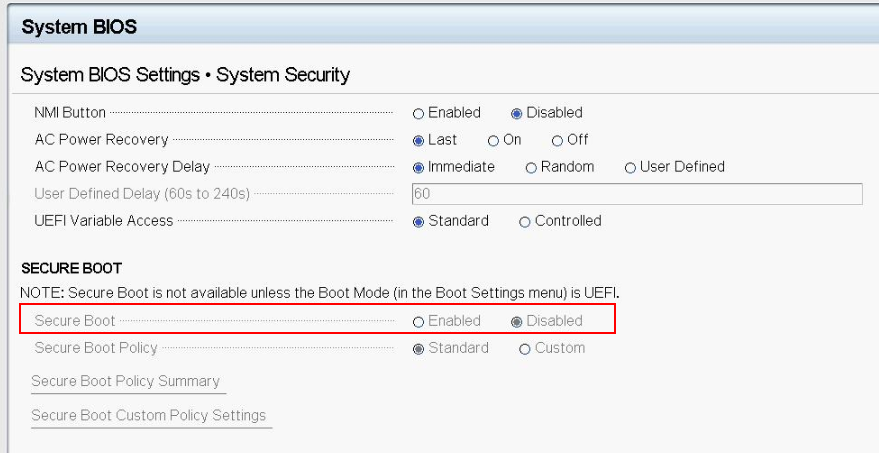 安裝 Windows2008R2SP1 之前 , 請確保已將係統設置程序中的安全引導選項設置為 "Disable"( 禁用 ) 。注 : 安全啟動 , 僅在 Windows2012R2 上被支持 ,同時 安全啟動 , 也隻在 UEFI 模式下受支持。
